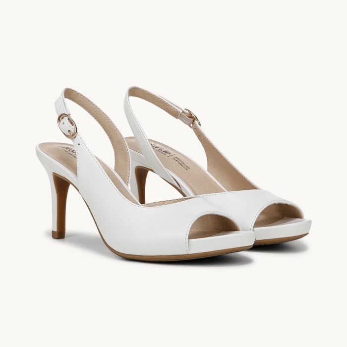 Walk into the room and own it with this stunning slingback pump. Faux leather with an open almond toe, heel sling strap with built-in stretch, and adjustable buckle closure.